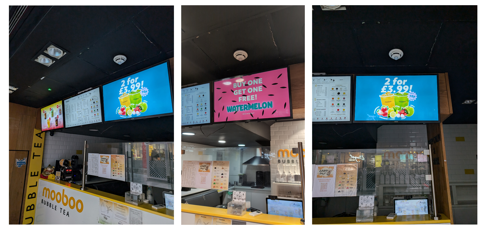 I was tasked with creating promotional designs for the in-store TV screens to encourage the sale of drink flavours that were about to run out of date. To create these designs I was given one asset, the image of 2 Mooboo drinks, the rest of the images used I resorted to sourcing online.