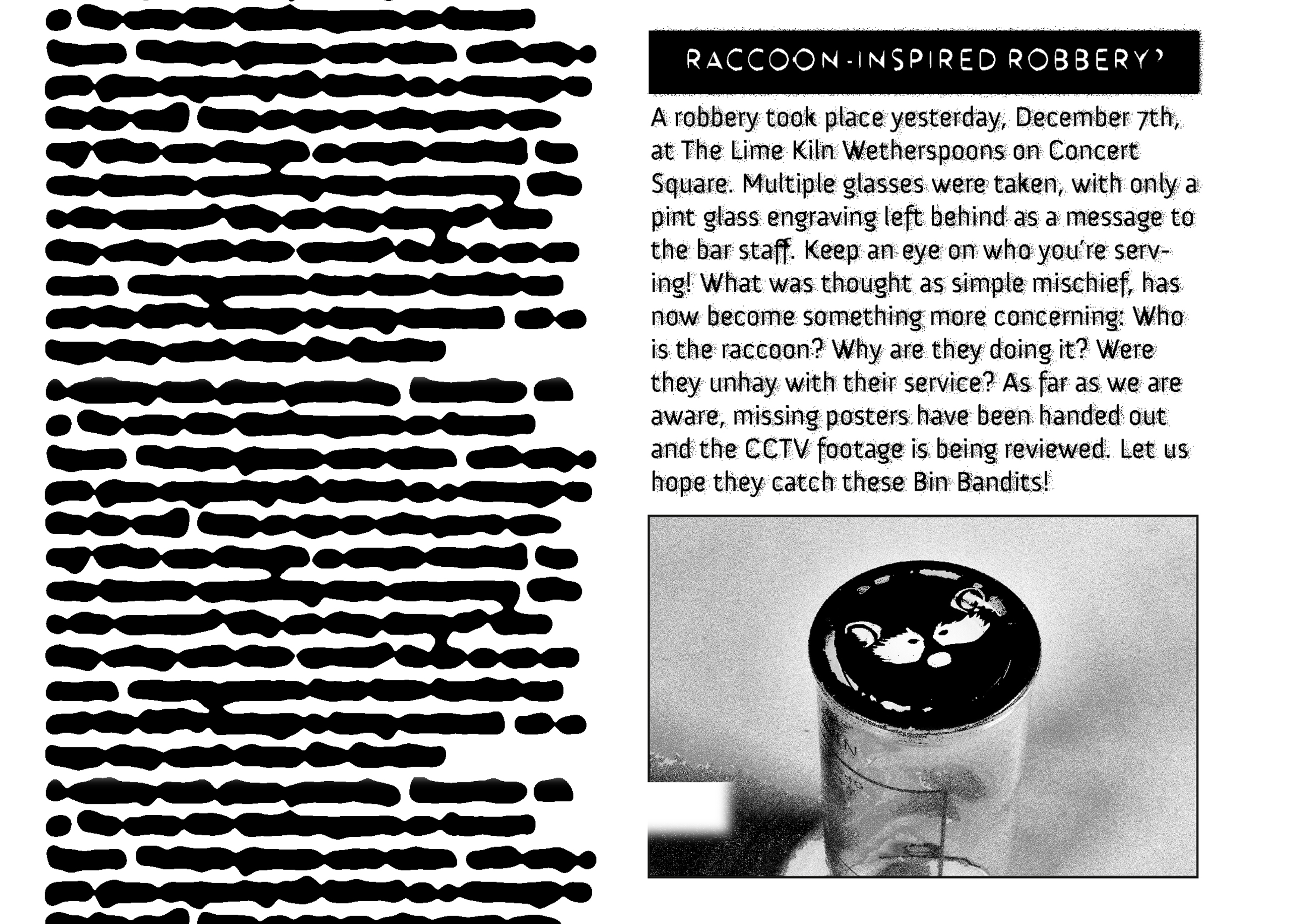 Due to the colour and aesthetic limitations of this project, I experimented using different mediums to emphasise the passage of time between each “crime”. Laser cutters were used to engrave the raccoon calling card symbol onto the pint glasses.
